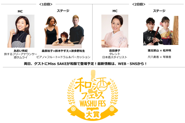 会場ステージでは、1日目は桑原裕子(ピアノ)×鈴木やすえ(フルート)×波多野祐生(ドラム&パーカッション)による和酒フェス特別ユニット、2日目は、瀧北榮山(尺八演奏)と松井咲(琴奏者)の和楽器ユニットの生演奏をお楽しみいただけます。