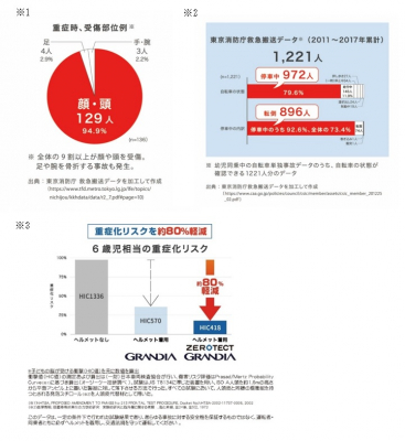 当社は、1997年の発売から累計販売数720万台を超える自転車用チャイルドシートメーカーのパイオニアとして「すべての子どもを自転車事故から守りたい」と、2016年に「ケガゼロミッション」を立ち上げ、製品開発や啓発活動に取り組んでいます。事故事例の収集・検証から、重症時の受傷部位は9割以上が顔や頭であること(※1)、子どもの乗せ降ろしや発進時の転倒事故が多いという事実(※2)が明らかになりました。そこで停車中の転倒から頭部を守るため、リブ構造で衝撃を吸収し、重症化リスクを約80%軽減する(※3)「ZEROTECT(ゼロテクト)」を開発し、頭部を270度守るアラウンドヘッドガードに搭載した自転車用チャイルドシートが「グランディアゼロシリーズ」です。