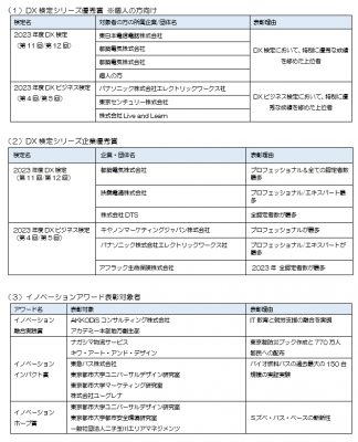 今回の表彰対象である2023年度(2023年4月〜2024年3月)では、「DX検定(TM)」シリーズ※にかかわる優秀な企業、個人を表彰する「DX検定シリーズ優秀賞 (個人の方向け)」「DX検定シリーズ企業優秀賞」、イノベーション・プロセスの学理深化と実践伸長に関して貢献された方を表彰する「イノベーション融合実践賞」「イノベーションインパクト賞」「イノベーションホープ賞」、の5部門で表彰をいたします。