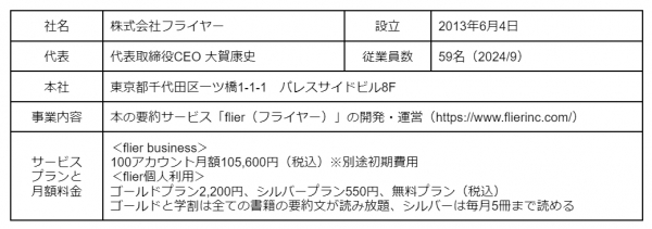 flierは、1冊10分で読める「本の要約サービス」です。ビジネス書の新刊や話題のベストセラー、名著の要約をウェブ、アプリで毎日公開。AIを使った音声版もあります。収録書籍数は3,700冊超、累計会員数は119万人を突破しました(2024年9月現在)。