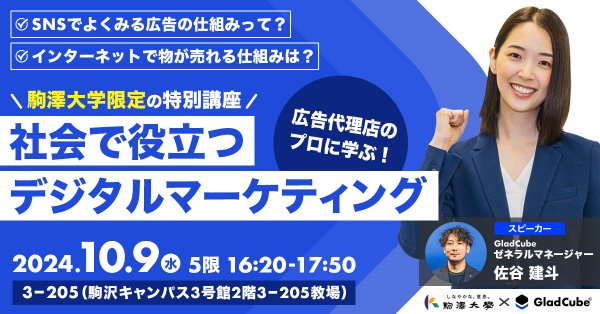 株式会社グラッドキューブ(本社:大阪市中央区 代表取締役 CEO 金島 弘樹 以下:グラッドキューブ)は、2024年10月9日(水)に駒澤大学の学生向けに、デジタルマーケティングと DX に関するリスキリング課外講座を実施いたします。