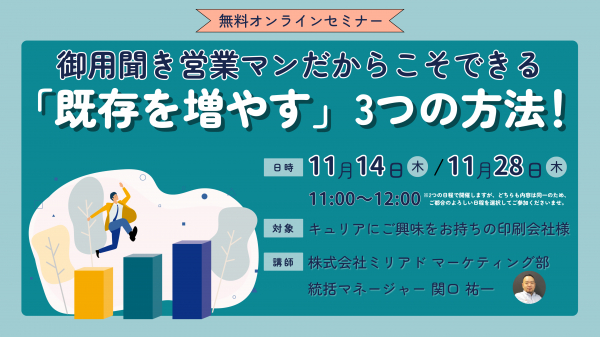 CEO:樋口 清政)は、2024年11月14日(木)/11月28日(木) AM11:00から、印刷業界向けに 御用聞き営業マンだからこそできる「既存を増やす」3つの方法 と題して、セミナーを開催することをお知らせいたします。