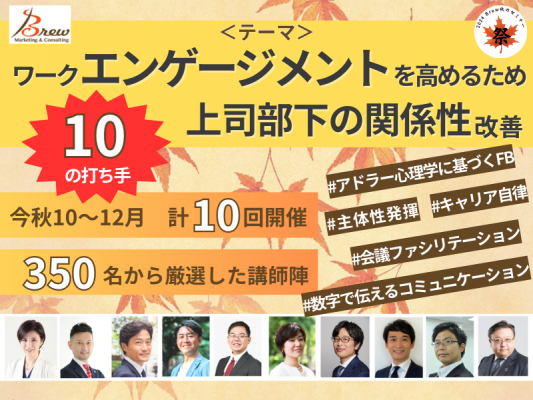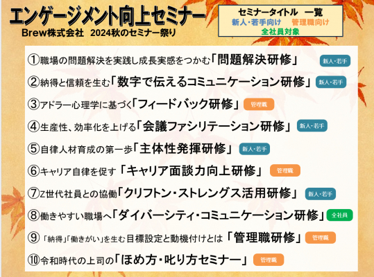 人材育成コンサルティング事業を手掛ける、Brew株式会社(所在地:東京都中央区銀座7丁目13番6号サガミビル2階、代表取締役:原 佳弘)は、オンライン無料セミナー「ワーク・エンゲージメントを高める10の打ち手」(https://brew-ing.com/seminar/seminar_autumn2024/)を、2024年10月23日(水)より開催致します。