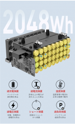 大容量2048Whを搭載し、アウトドアや緊急時に充分な電力を確保。
