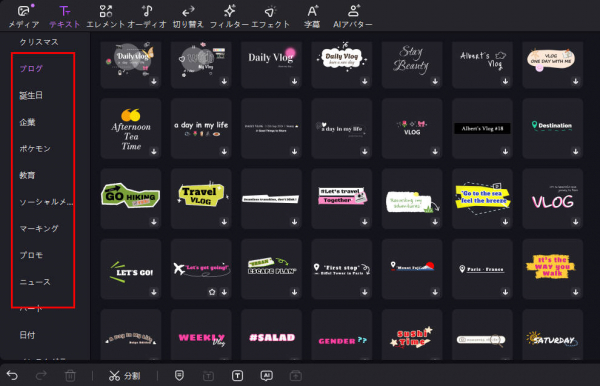 2. HitPaw Edimakorのテキスト素材ライブラリは、クリエイティブなテキストコンテンツを簡単に追加できる、豊富でパワフルなリソースです。以下がその主な特徴です: