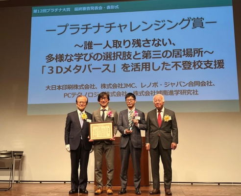 株式会社城南進学研究社(本社:神奈川県川崎市、代表取締役社長CEO:下村勝己、以下「当社」)が運営に参画する「バーチャル・ラーニング・プラットフォーム(VLP)」における「3Dメタバースを活用した不登校支援の取り組み」が、一般社団法人プラチナ構想ネットワーク(本社:東京都千代田区、会長:小宮山宏)が主催する「第12回プラチナ大賞」で、「プラチナチャレンジング賞」を受賞しました。2024年11月6日(水)に最終審査発表会・表彰式が行われ、小宮山会長より表彰状とトロフィーを進呈いただきました。
