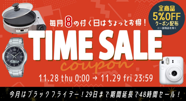 ホームショッピング公式ショップ「8の付く日+ブラックフライデー 5%OFFクーポンセール(一部セール除外品あり)」明日2024年11月28日(木) 0:00〜 29日(金)23:59開催予定