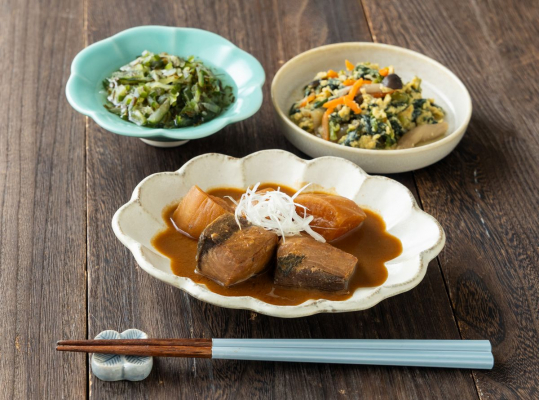 ぶりは、水温が高い暖流系の魚ですが、海水温上昇影響か、近年北海道全域でも水揚げされるようになっていて、年々漁獲量は増えています。北海道の天然ぶりは、冷たい海で栄養豊富なエサを食べて育つため、脂がのっていて、引き締まった身と豊かな旨みが特徴です。今回は、冬野菜の代表格である大根と一緒に「北海道産ぶりと大根の味噌煮」を作りました。味噌は、赤味噌を使って、コクと風味を出しています。副菜には、少し甘めに味付けした「ほうれん草としめじの卵とじ」と、あかもくのネバネバと胡瓜のシャキシャキが楽しめる「佐渡島産あかもくと胡瓜の和サラダ」をセットにしました。一品ずつ個食パックしているので便利です。