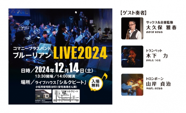 今回のライブでは、ブルーリアンの演奏に加え地元の中海中学校の吹奏楽部ともコラボ演奏するコーナーを設け会場を盛り上げます。これはSDGs実現を目指す自社の活動も取り込み、【ゴール11「住み続けられる街づくりを」】のゴール達成に向け、地域で活躍されている学生の皆さんと一緒に演奏することで地域活動の活性化に繋げたいという想いから実現しました。ライブではゲスト奏者を3名お迎えし、テレビ番組などで聞きなじみのある「ルパン三世のテーマ」や「君の瞳に恋してる」、コラボ演奏では今年話題となった「bling-bang-bang-born」など、12曲をご披露いたします。