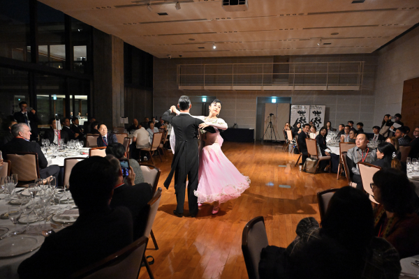 会期1日目の夕刻に行われた、記念晩餐会では、主催者の華園 ふみ江 による、オープニングアクトとして、ワルツが披露されました。参加者の皆様への感謝の意を表すべく、約1年の準備期間で、振付、選曲、練習を重ねたワルツでした。ブルガリア大使館から提供されたブルガリアワイン、特別ゲストの藤沼 哲朗様によるオペラの歌唱も行われ、和やかな国際交流の社交の場となりました。