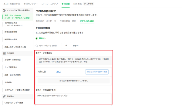特定のお客様にのみ予約を制限したい場合など、状況に応じて予約ページの表示・非表示を切り替えることが可能になりました。