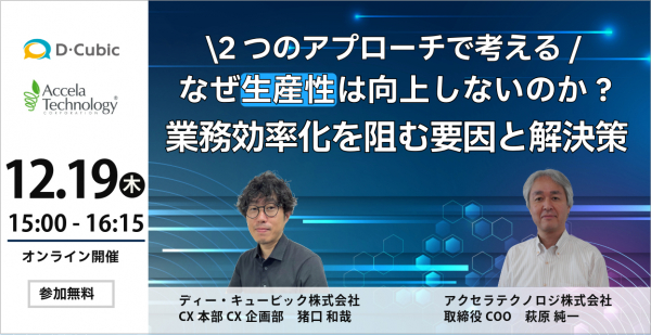 アクセラテクノロジ株式会社(本社:東京都渋谷区、代表取締役社長:進藤達也、以下「アクセラテクノロジ」)は、12月19日(木)にディー・キュービック株式会社(本社:東京都渋谷区、代表取締役社長:岸本享、以下「ディー・キュービック」)との共同開催セミナーを開催します。