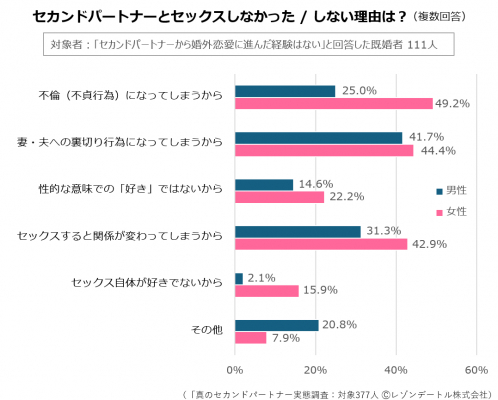 男女とも「配偶者への裏切りになるから」との回答が半数を割り、予想よりも低いものでした。