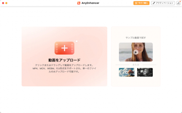 Step1.AnyEnhancerを起動し、4Kに変換したい動画をアップロードします。対応形式が多いため、どんな動画でも簡単に処理できます。
