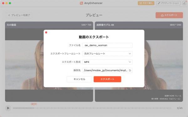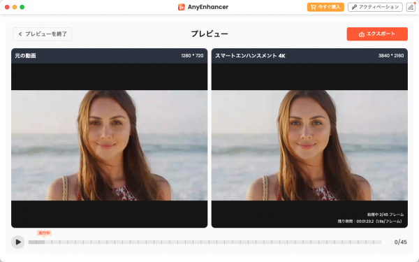 Step3.AIが自動で動画を高画質化。処理が完了したら、プレビューで画質を確認し、満足したら動画をエクスポートします。もし必要なら、さらに4KをフルHDに変換して、ファイルサイズを調整することもできます。