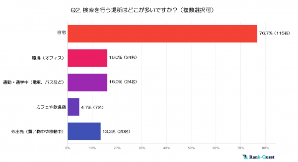 一方、「職場(オフィス)」と「通勤・通学中(電車、バスなど)」はいずれも16%で並び、仕事や移動の合間に検索を行う層が一定数いることがうかがえます。