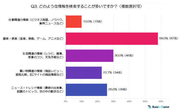 一方で、移動中や職場など時間や場所を問わず検索する層も少なくありません。趣味・娯楽だけでなく、生活関連の情報(レシピ・健康・天気予報など)やニュース、買い物、仕事関連といった多岐にわたるジャンルが検索されており、20代の情報ニーズの幅広さを裏付ける結果となりました。