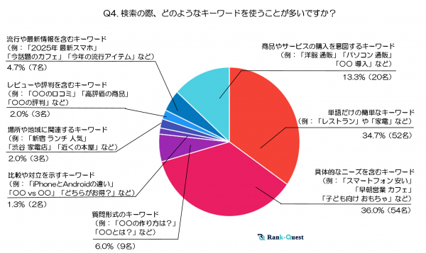 また、「質問形式のキーワード」は6%、「レビューや評判を含むキーワード」は2%と、疑問や他者の評価を参考にする検索も少なくありません。