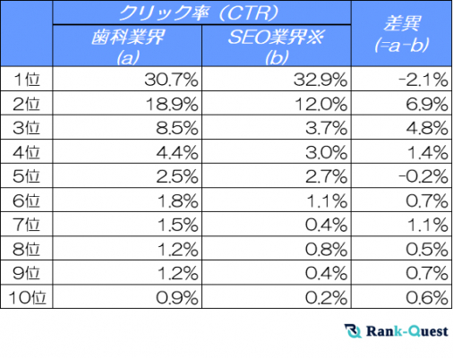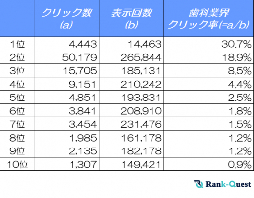 https://rank-quest.jp/column/column/how-to-seo/ 【SEO対策】で検索順位No.1を獲得した(注1)ランクエストが歯科業界1〜10位の検索順位毎のクリック率を解説!