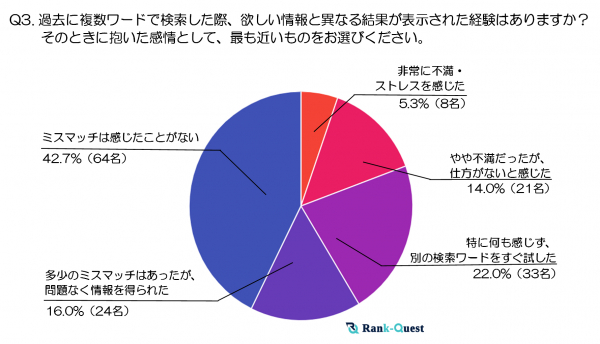 最も多かった回答は「ミスマッチは感じたことがない」(42.7%)で、次いで「特に何も感じず、別の検索ワードをすぐ試した」(22%)が続きます。つまり、全体の6割以上が「ミスマッチに大きな不満を持たない、あるいはすぐにリカバリーしてしまう」という結果になり、複数ワード検索が大きなストレス要因になっていない現状が見て取れます。