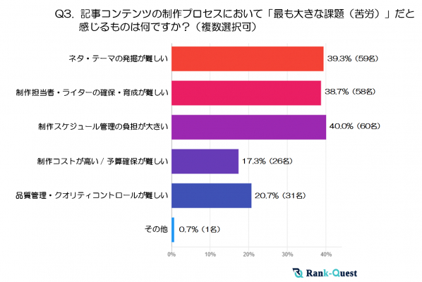 これらの結果から、記事コンテンツ制作では「スケジュール管理」、「アイデア出し」、「制作リソース(人材)の確保」が大きなボトルネックになっていることが読み取れます。