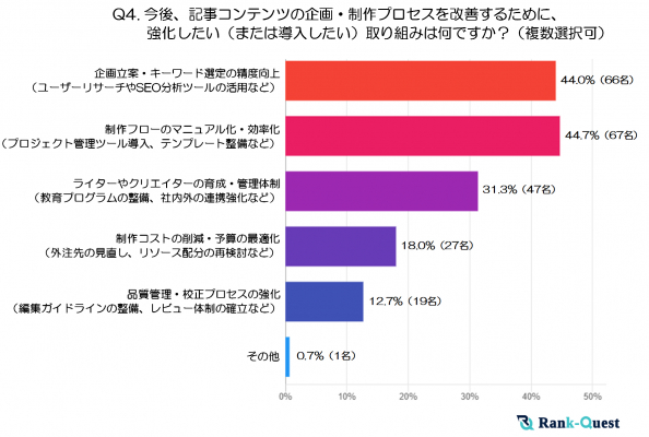 最も多かった回答は「制作フローのマニュアル化・効率化」で44.7%、次いで「企画立案・キーワード選定の精度向上」が44%でした。いずれも記事コンテンツの制作プロセスをより効率的・戦略的に進めるための取り組みが上位に挙がっていることが特徴的です。