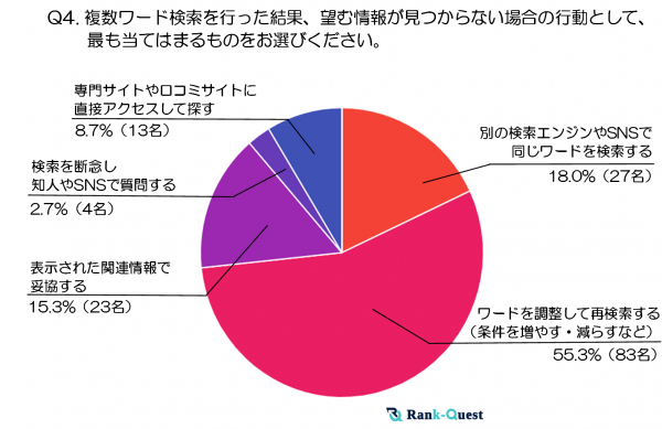 最も多かった回答は「ワードを調整して再検索する(条件を増やす・減らすなど)」(55.3%)で、半数以上がキーワードを見直して粘り強く検索を続ける傾向がうかがえます。