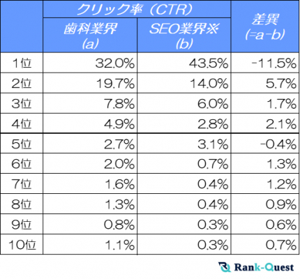 6位以降は歯科業界の方がやや高い数値を示しており、下位の順位でも一定数クリックされる余地があるようです。
