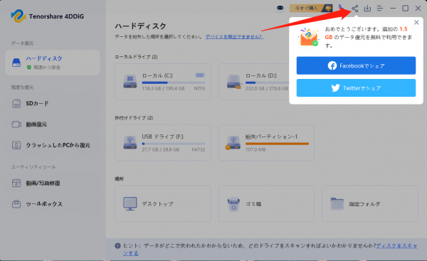 1.Tenorshare 4DDiGが起動後の画面で、復元したい写真などのデータが存在するドライブやパーティションを選択します。「スキャン」をクリックします。(初めは500MB無料、SNSへ共有してさらに1.5GBの無料復元量を取得)