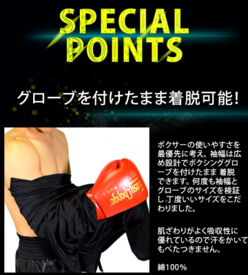 ボクサーの使いやすさを最優先に考え、袖幅広めの設計でボクシンググローブを付けたまま 着脱できます。何度も袖幅とグローブのサイズを検証し丁度いいサイズにこだわりました。