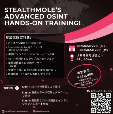 株式会社JIRAN JAPAN (本社:東京都港区、代表:張 世鴻)は、StealthMoleを使った「OSINTハンズオントレーニング」を2025年5月27日〜29日の3日間、東京 秋葉原で開催することをお知らせし、本日より参加者を募集いたします。