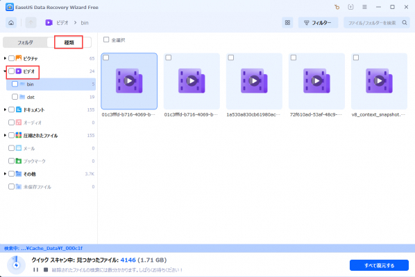 ステップ2.スキャンが完了した後、「種類>ビデオ」をクリックして、検出された動画が一つずつ確認することができます。