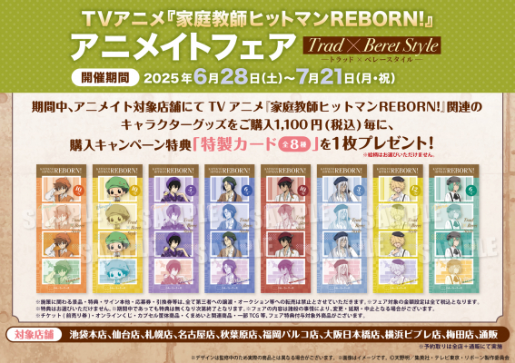 【TVアニメ『家庭教師ヒットマンREBORN!』アニメイトフェア Trad×Beret Style】が《2025年6月28日(土)〜7月21日(月・祝)》の期間、アニメイト各店で開催決定!