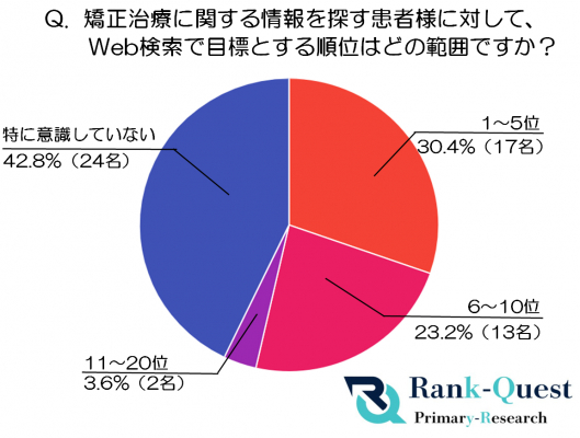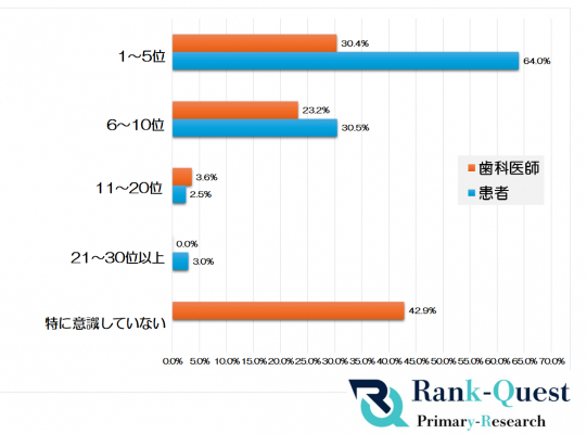 歯科医師を対象に行ったアンケートでは、「特に意識していない」と回答した割合が最も高く42.8%となりました。一方で、約3割(30.4%)の歯科医師は「1〜5位」を理想的な表示範囲と考えており、次いで「6〜10位」(23.2%)、「11〜20位」(3.6%)と続きました。