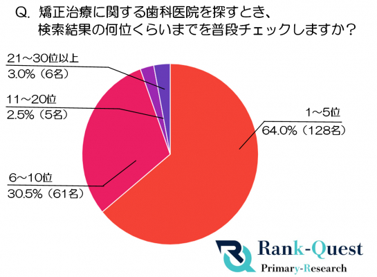 患者を対象に行ったアンケート結果によると矯正治療に関する歯科医院を探す際、検索結果の「1〜5位」をチェックするという回答が最も多く64%でした。次いで「6〜10位」が30.5%となっており患者の約95%が検索結果の1ページ目(1〜10位)以内で情報を収集していることが分かります。