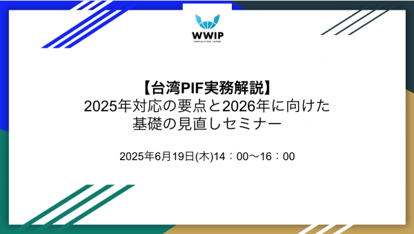 株式会社ワールドワイド・アイピー・コンサルティングジャパン (以下「WWIP」 : 東京都文京区) は、2025年6月19日(木)14:00〜16:00に、「台湾PIF実務解説〜2025年対応の要点と2026年に向けた基礎の見直し〜」を開催いたします。
