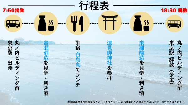 旅行代金に含まれるもの:酒蔵見学および試飲、昼食(ペアリング日本酒含む)、貸し切りバスによる移動、ガイド・保険代