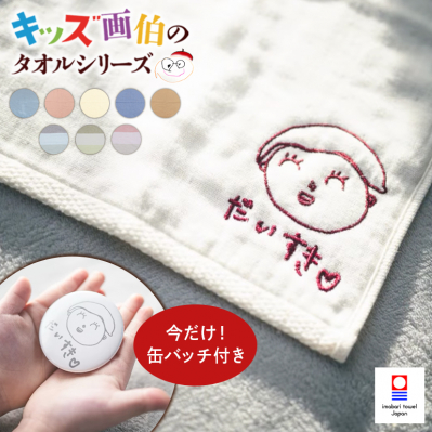▲キッズ画伯のタオルシリーズ限定缶バッジ付