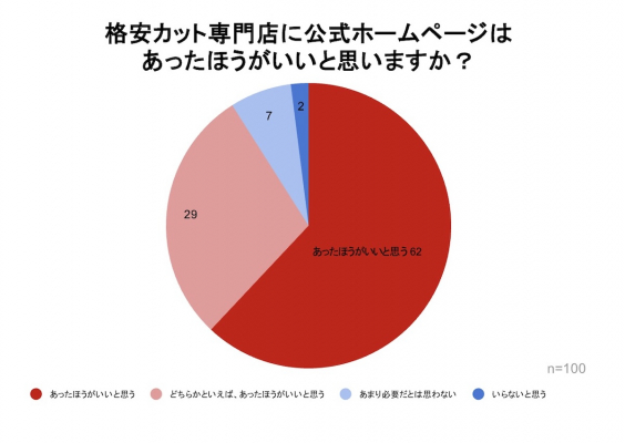「千円カットや格安カット専門店に公式ホームページはあったほうがいいと思いますか?」の質問では、『あったほうがいいと思う』が62%、『どちらかといえばあったほうがいいと思う』が29%、『あまり必要だとは思わない』が7%、『いらないと思う』が2%という結果となりました。