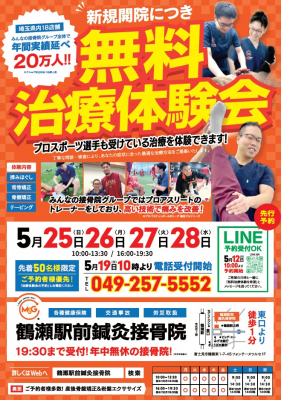 株式会社MSG 鶴瀬駅前鍼灸接骨院 新規開院に先駆けてプレオープン!5/25(日)〜5/28(水)