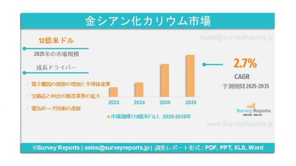 Survey Reports LLCは、2025年5月に「カリウム金シアン化物市場セグメンテーション:タイプ別(低純度と高純度)、用途別(金属めっき、装飾用コスチュームジュエリー、電子機器、時計、その他の用途)、最終ユーザー産業別(電子機器、ジュエリー、化学、その他)」に関する調査報告書を発行したことを発表しました。- グローバル市場分析、動向、機会、および予測(2025-2035年)は、カリウム金シアン化物市場の予測評価を提供します。この報告書では、カリウム金シアン化物市場における主要な市場動向、成長要因、市場機会、課題、および脅威を強調しています。