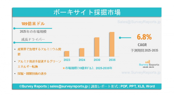 サーベイ・リポートズ・エルエルシーは、2025年5月に「ボーキサイト鉱山市場セグメンテーション」に関する調査報告書を発行したことを発表しました。この報告書は、グレード別(冶金用、耐火物用);用途別(冶金用アルミニウム、研磨材、耐火物、セメント、化学品、鋳物、鋼鉄、石油、触媒セメント、塗料・ニス、その他); 鉱物学別(トリハイドレートまたはギブシット型ボーキサイト、混合ボーキサイト、モノハイドレート型ボーキサイト);地質形成別(ラテライト(シリケート型ボーキサイト)、カルスト(炭酸塩型ボーキサイト));最終用途産業別(化学、石油・ガス、輸送(乗用車、軽商用車(LCV)、 大型商用車(HCV))、航空宇宙(商用航空機、軍事航空機、その他)、電気・電子(変圧器、コンデンサ、モーター・発電機、その他)、建築・建設(住宅、商業、工業、インフラ、農業、食品・飲料、消費財、その他) - グローバル市場分析、動向、機会、および予測(2025-2035年)は、ボーキサイト採掘市場の予測評価を提供します。このレポートでは、ボーキサイト採掘市場における主要な市場動向、成長要因、市場機会、課題、および脅威を強調しています。