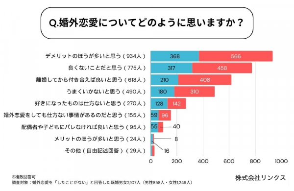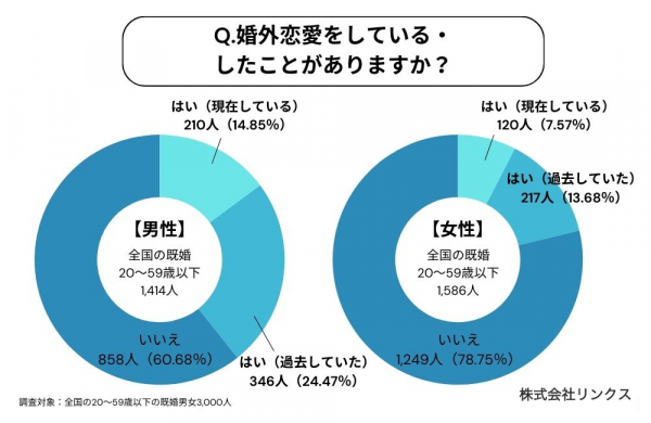 既婚者向けマッチングアプリ「既婚者クラブ」のユーザーを対象に、株式会社リンクス(東京都港区)が全国の20歳〜59歳までの既婚男女3,000人を中心に、「婚外恋愛の実態調査」を実施しました。