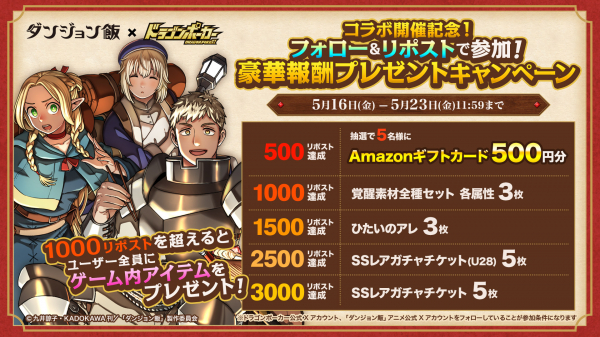 5月16日(金)より、TVアニメ『ダンジョン飯』とのコラボイベントを記念して「コラボ開催記念フォロー&リポストで参加!豪華報酬プレゼントキャンペーン」を実施いたします。対象ポストのリポスト数に応じて豪華アイテムや、抽選でギフトカードをプレゼント!キャンペーンへのたくさんのご参加お待ちしています!