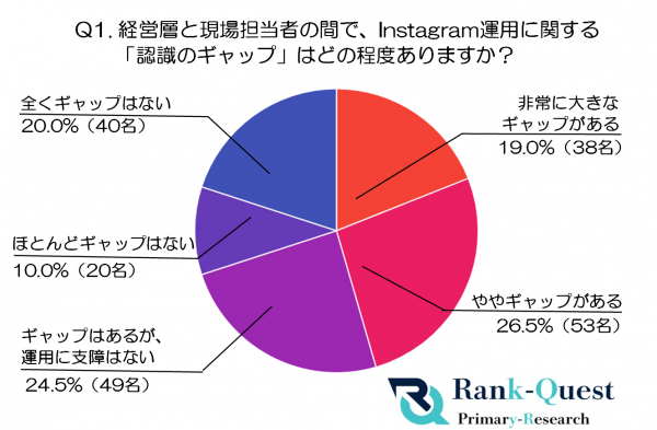 このアンケート結果から、Instagram運用における「経営層と現場担当者の認識ギャップ」は、全体の70%が「何らかのギャップがある」と認識していることがわかります。