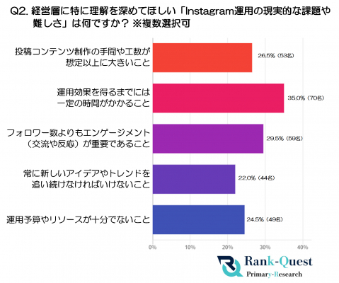 そこで、【インスタ運用代行】で検索順位No.1を獲得した実績(注1)を持つランクエスト(https://rank-quest.jp/column/column/instagramoperationagency/ )は、2025年5月14日にInstagram運用担当者200名を対象とした独自アンケート調査を実施しました。