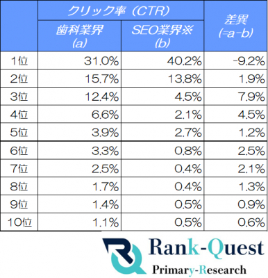 さらに、SEO業界向けの自社サイト(注2)のクリック率データと比較することで、歯科業界特有のクリック傾向やユーザー行動の違いも明らかにしています。