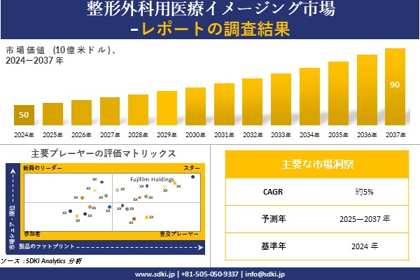 SDKI Analytics(本社:東京都渋谷区)は、このたび、2025年05月19に「整形外科用医療イメージング市場調査レポート:2025−2037年の市場規模、シェア、傾向の予測」を発表しました。整形外科用医療イメージングに関する市場調査レポートには、統計的および分析的アプローチを使用した予測評価が含まれています。この調査レポートでは、一次および二次調査方法を使用して分析された主要な業界洞察を通じて将来の傾向を理解できるようにすることで、主要な市場動向を読者に説明しています。