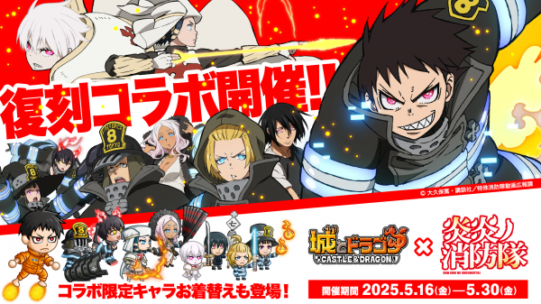 株式会社アソビズム(本社:東京都千代田区、代表取締役:大手智之)は、App Store・Google Playにて好評配信中の『城とドラゴン』で、2025年5月22日(木)より、TVアニメ『炎炎ノ消防隊』コラボイベント「リーダー腕利きGP」を開催いたします。