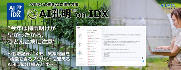 こうした“ベテランの勘”に支えられてきた農業の現場には、紙や口頭、個人のノートにしか記録されていない経験知=暗黙知が今も数多く存在してします。しかし、農業の担い手不足や高齢化が進む中で、その貴重なノウハウが継承されないまま失われていくという危機が現実のものになっています。こうした声を受け、企業データとAIの利活用カンパニー、AIデータ株式会社(本社:東京都港区、代表取締役社長 佐々木隆仁、以下AIデータ社)は、生成AIとデータ統合基盤を組み合わせたソリューション「AI孔明TM on IDX」によるベテランの勘をAIに残す新たな方法を提案します。